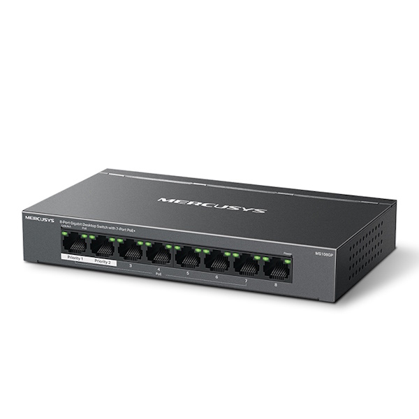 Το MS108GP είναι ένα ισχυρό gigabit switch με 7 θύρες PoE+ (Power over Ethernet), ιδανικό για σύγχρονες εγκαταστάσεις όπου η τροφοδοσία και η σύνδεση δικτύου πρέπει να γίνουν εύκολα και αποτελεσματικά. Οι θύρες 1 έως 7 υποστηρίζουν PoE+ σύμφωνα με το πρότυπο IEEE 802.3af/at, παρέχοντας έως 30W ισχύ η καθεμία, με συνολική διαθέσιμη ισχύ 65W. Αυτό το χαρακτηριστικό το καθιστά ιδανικό για την τροφοδοσία IP καμερών, access points, IP τηλεφώνων, καταγραφικών και άλλων συσκευών χωρίς την ανάγκη ξεχωριστών τροφοδοτικών.
