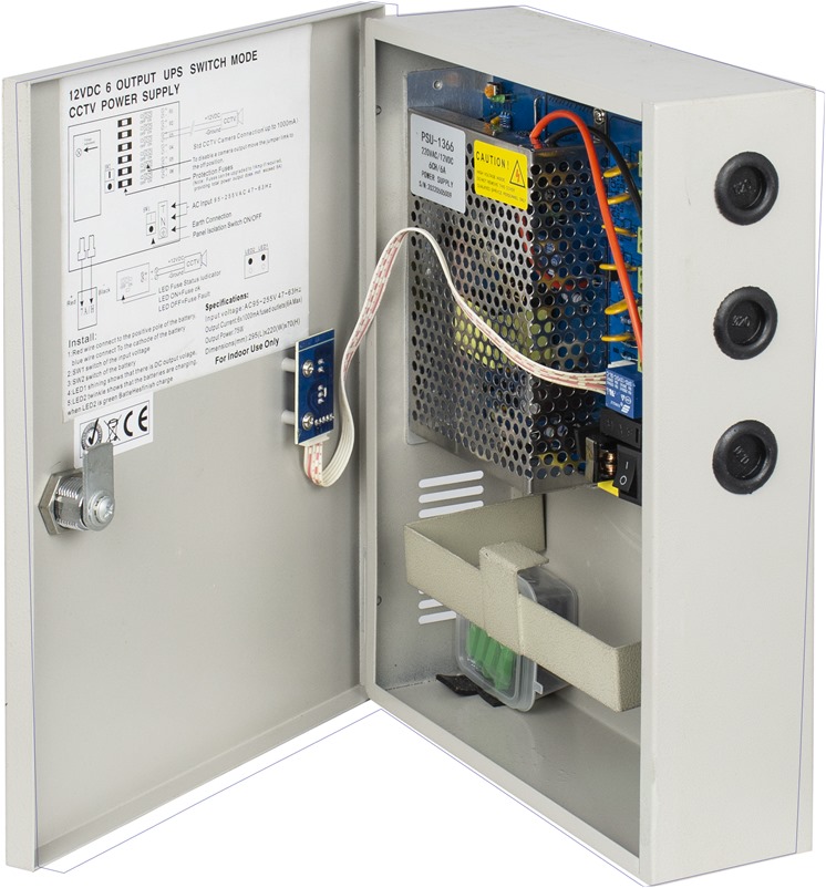 Tροφοδοτικό 12VDC 6Α (6 OUTPUTS x 12VDC 1A). Δυνατότητα τοποθέτησης μπαταρίας αυτονομίας 12V/7AH (Δεν περιλαμβάνεται).